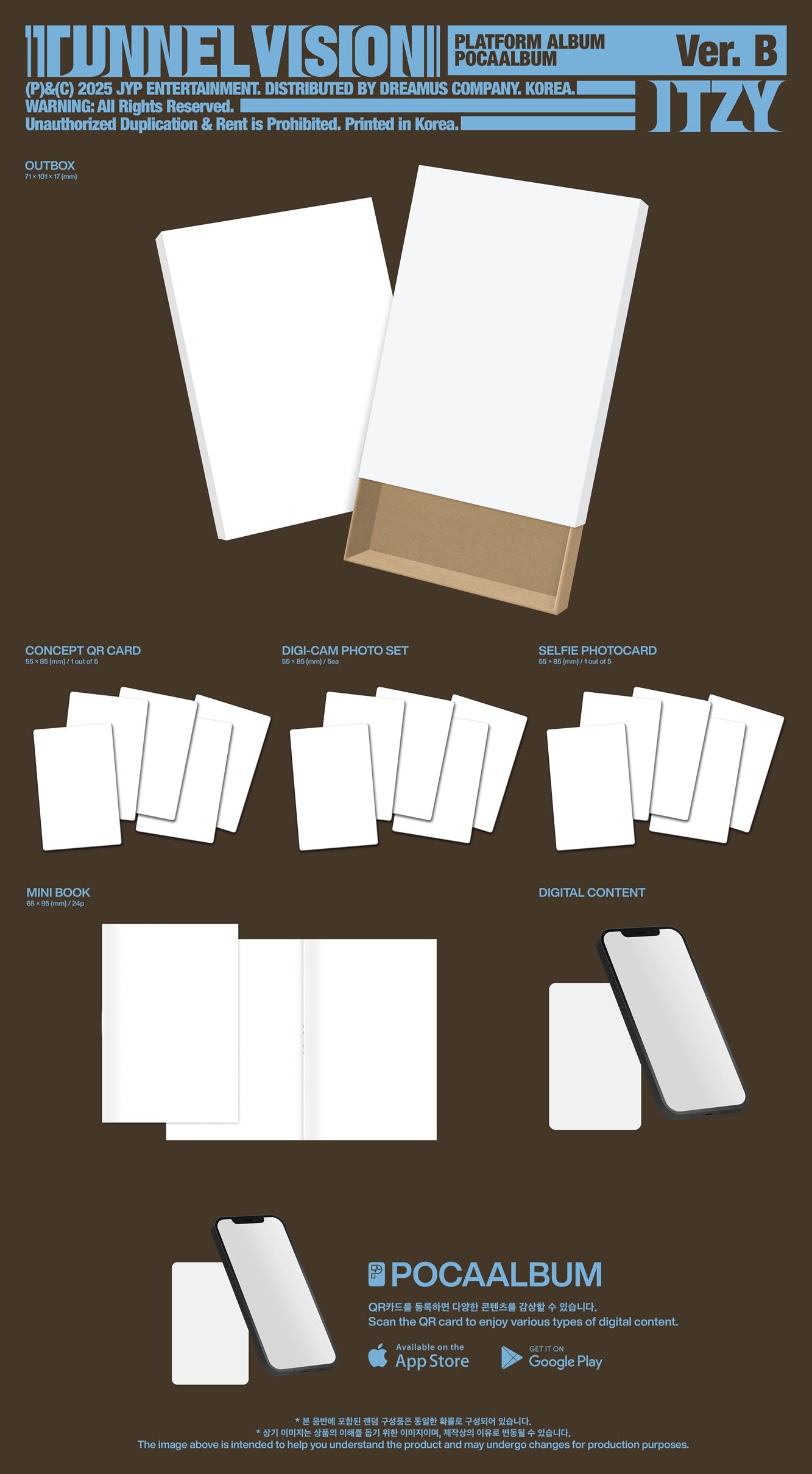 Introducing the POCAALBUM version of ITZY's mini-album, [TUNNEL VISION]. This version utilizes a QR card format, allowing fans to enjoy the music via smartphone. It consists of 2 distinct versions, offering various digital contents like digital photocards, providing a different experience from the physical albums.